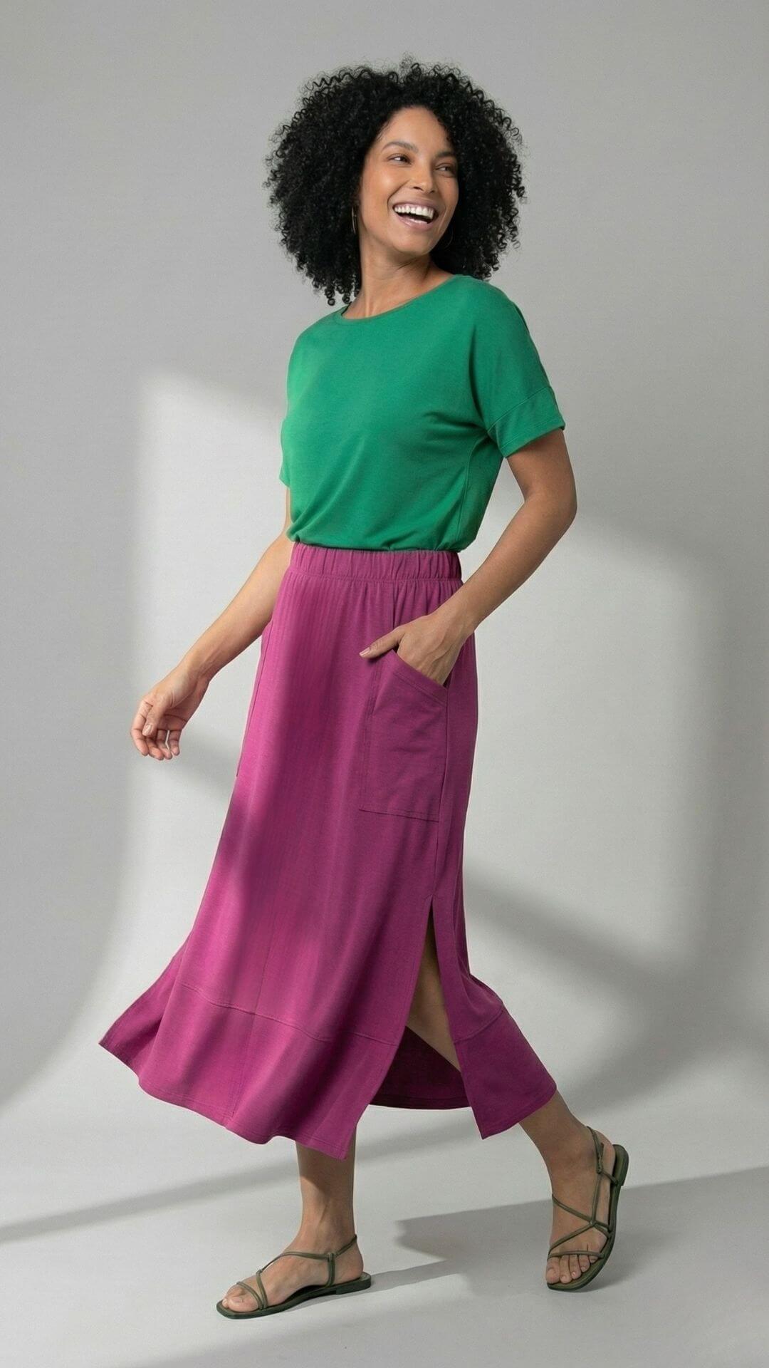 Saia Carolina possui corte evasê, com bolsões chapados na lateral e para trazer modernidade possui recorte na barra com uma leve fenda lateral que te dá todo o conforto e mobilidade =)