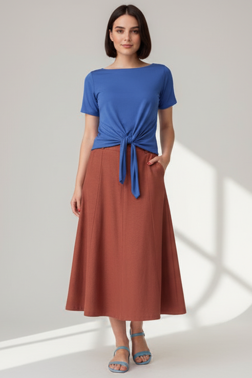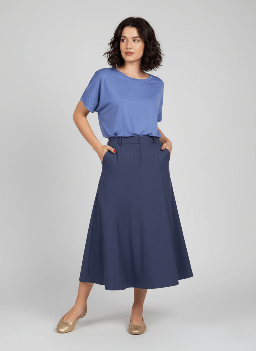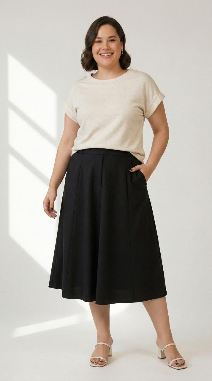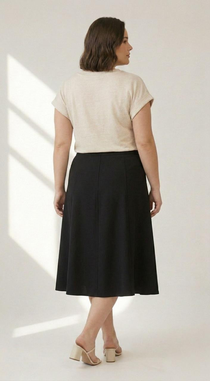 A Saia Salete é em corte A, mais acinturada em cima e abre embaixo. Dando um efeito rodado maravilhoso e muito elegante. Comprimento alonguete com costuras rebatidas em toda a sua extensão, fazendo a curva do corpo.