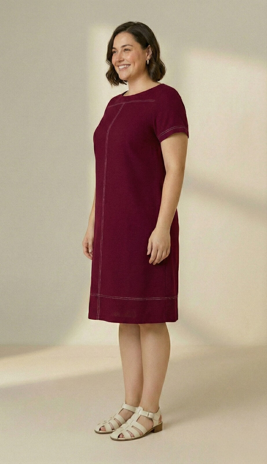 Sua modelagem é evasê, soltinha, possui bolsos e pespontos contrastante, ele valoriza com conforto.
